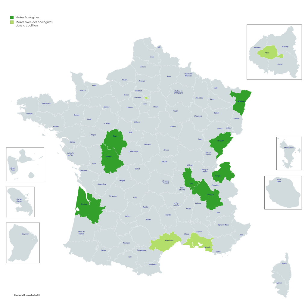 Dans toutes ces villes, des listes écologistes ont été élues, ou réélues à Grenoble. C’est le cœur de la « vague verte ».