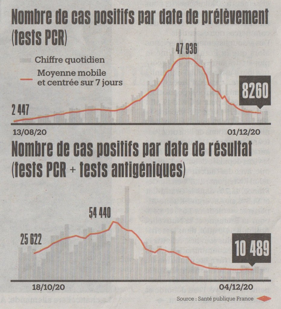 Comme nous le savons sûrement tous, le président Emmanuel Macron a annoncé un assouplissement du confinement le 15 décembre il y a déjà deux semaines. Oui, un assouplissement mais à une condition, car rien n’est gratuit dans la vie : il faut qu’il y ait moins de 5000 cas Covid-19 par jour ! Bien que les chiffres aient baissé, nous sommes encore loin de l’objectif, avant-hier encore 11 022 personnes ont été testés positives. Des personnes politiques n’y croient plus : « Les chiffres remontent, ils n’atteindront pas les 5000 cas par jour d’ici le 15 décembre » aurait confié Olivier Véran. Malheureusement, il est fort possible que Macron repousse la date fixée.