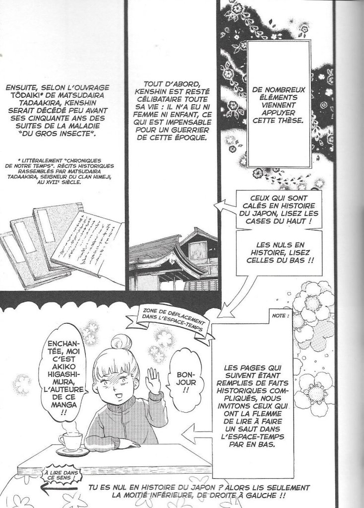 Le début du manga, très bien mis en page, raconte très précisément l’histoire du Japon de 1530. La présentation est particulière : la page est divisée en deux, la partie du haut pour ceux qui sont très très intéressés par l’histoire du Japon et la partie du bas (qu’elle a nommé « la pause thé d’Akiko ») où l’autrice résume avec pas mal d’humour des choses anecdotiques. Elle adresse vraiment cet espace aux « nuls en histoire ».