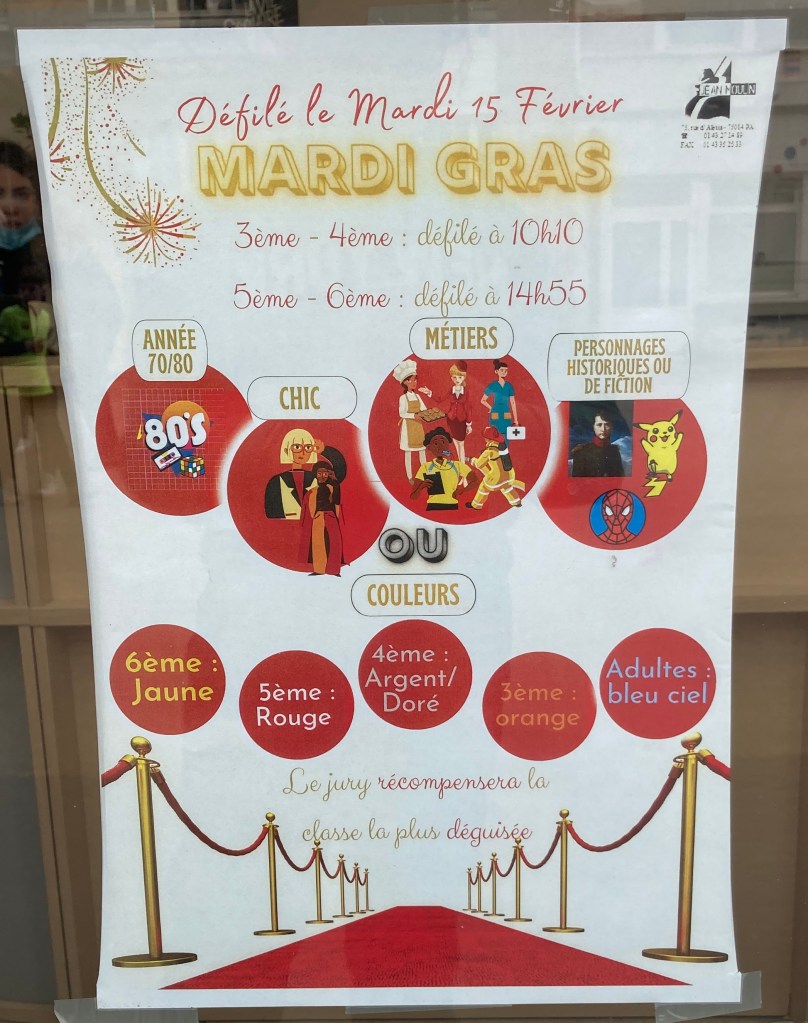 Le mardi 15 février les élèves de Jean Moulin étaient invités à venir au collège déguisés. A la récré du matin, les adultes ont organisé un défilé où ils ont déroulé le tapis rouge. A la récré de mi-journée, c’était les 3è et les 4è qui défilaient sur de la musique. A la récré de l’après-midi c’était le tour des 6è et des 5è de défiler sur le tapis rouge.