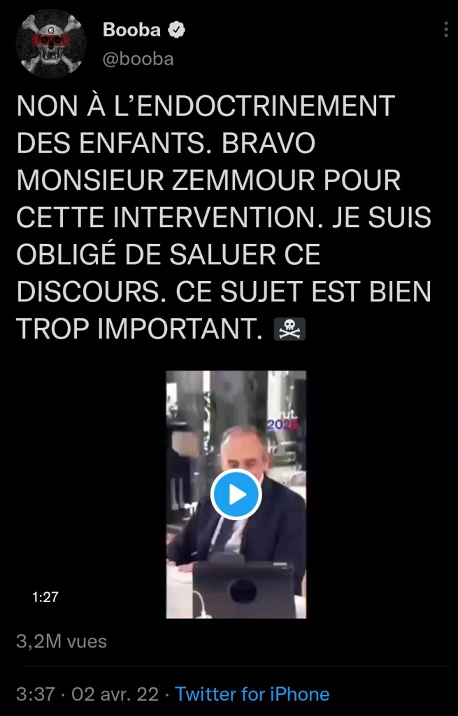 Dernier scandale : il approuve les idées de Zemmour ayant « dénoncé » un « endoctrinement » (= une influence, une manipulation psychologique) des enfants dans les écoles par les lobbys LGBT !