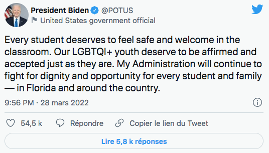 Plus important que ça, Joe Biden a réagi en personne : « Chaque élève mérite de se sentir en sécurité et le bienvenu dans sa classe. Nos jeunes LGBTQI+ méritent d’être acceptés tels qu’ils sont. Mon administration continuera à se battre pour la dignité de chaque élève, en Floride et dans tout le pays » » Cette loi qui vise les personnes transgenres est injuste ! Mon gouvernement s’oppose à ces lois horribles ! «