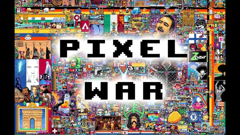 Du 1er avril au 5 avril, la plateforme Reddit a donné accès à ses utilisateurs universels à une page blanche, sur laquelle ils pouvaient placer un pixel d’une couleur choisie toutes les 5 minutes. Au fur et à mesure du temps, de nombreux utilisateurs ont voulu représenter leur pays. C’est alors que la plupart des streameurs internationaux de Twitch ont commencé à se regrouper avec leurs communautés pour gagner la Guerre des Pixels, en anglais « Pixel War ».
