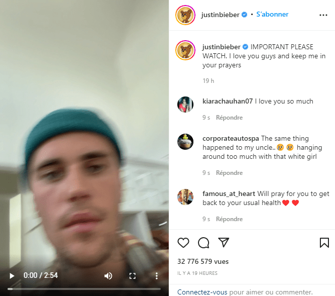 Dans un post Instagram, le célèbre chanteur âgé de 28 ans annonce souffrir du syndrome de Ramsay Hunt. Le numéro 1 en 2021 sur Spotify a désormais la moitié droite de son visage paralysée ! Il montre dans sa vidéo qu’il ne peut en effet cligner que d’un seul œil et sourire avec un seul côté de sa bouche. L’interprète de Peaches ne peut donc pas contrôler l’entièreté des muscles de son visage !