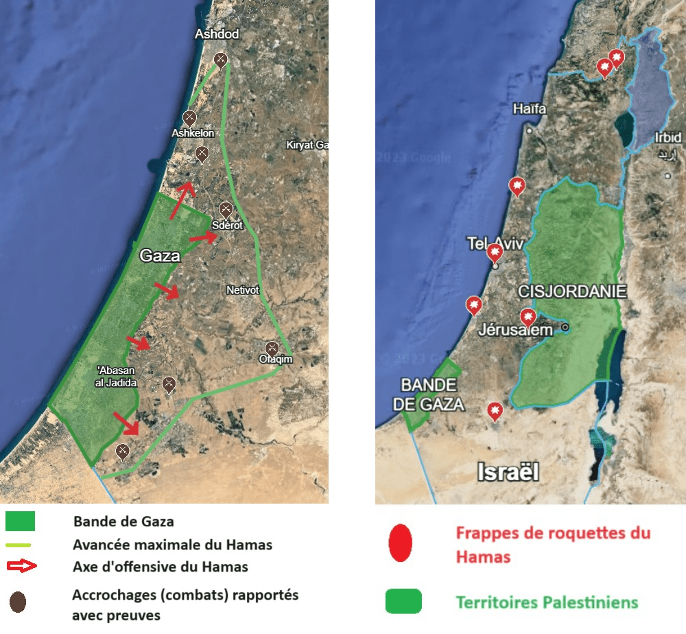 Les terroristes du Hamas ont réussi à entrer dans les villes de Sdérot et Ashkelon et ont poussé en une journée jusqu’aux villes d’Ashdod au Nord, Ofaqim à l’est, Kerem Shalom au sud. Leur avancée la plus significative a été à l’est (Ofaqim), où l’armée israélienne a été la moins résiliente.