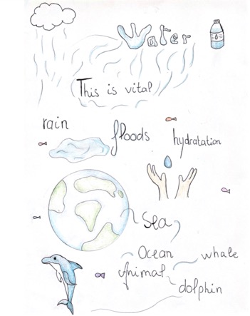 Here is a poster about water and climatic events such as rain or floods. But also words that make us think of water like the sea, the ocean but also marine animals like whales, dolphins or even turtles.