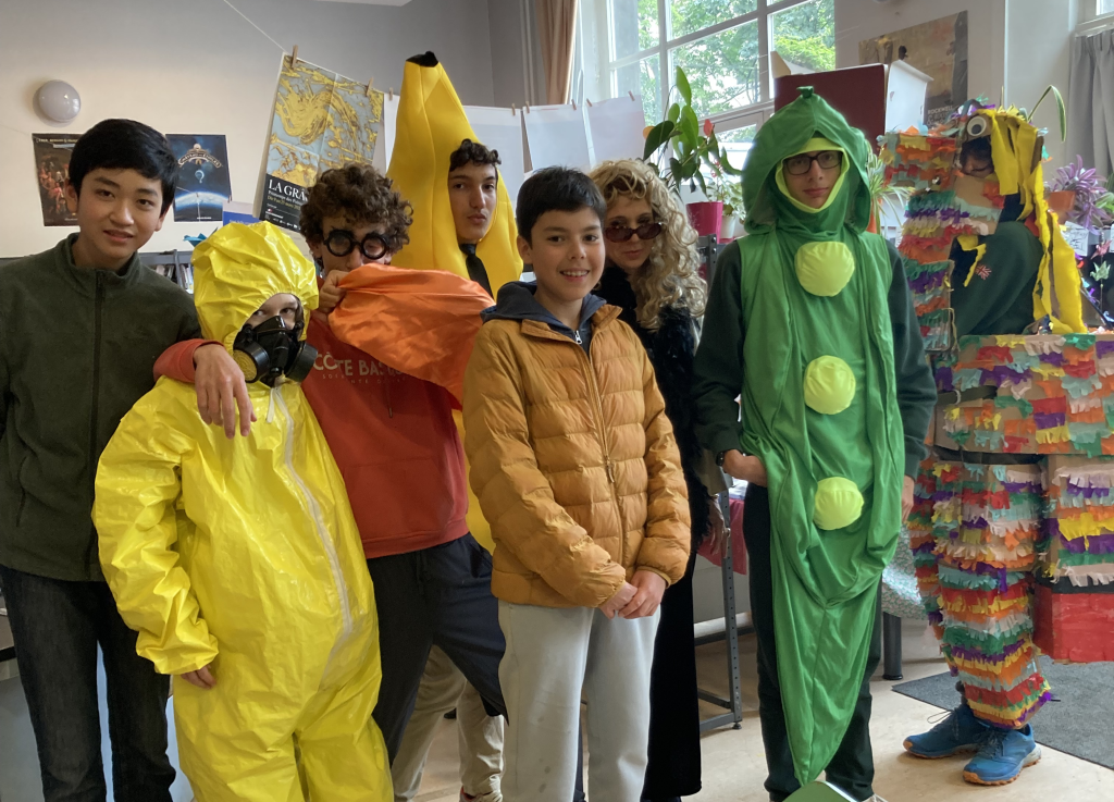 Il y a eu deux défilés dans la journée, celui des 3e et 4e pendant la récréation de 10 heures, et celui des 6e et 5e pendant la récréation de 15 heures. Les déguisements ont étés très variés, des élèves étaient parfois à plusieurs pour que leur déguisement fassent sens. Par exemple, il y avait un Mario et un Luigi. Les membre de la rédaction étaient aussi déguisés. J’ai vu Diego en Pinata, Justin en banane, Emile en petits pois. En dehors de la rédaction, il y avait un piment, une carotte, des personnages de Subway Surfer (un jeu vidéo). Il y avait aussi des fées, mon professeur d’anglais en cow-boy et mon professeur de sport en sumo. Il y avait aussi beaucoup de professeur en Men in Black.