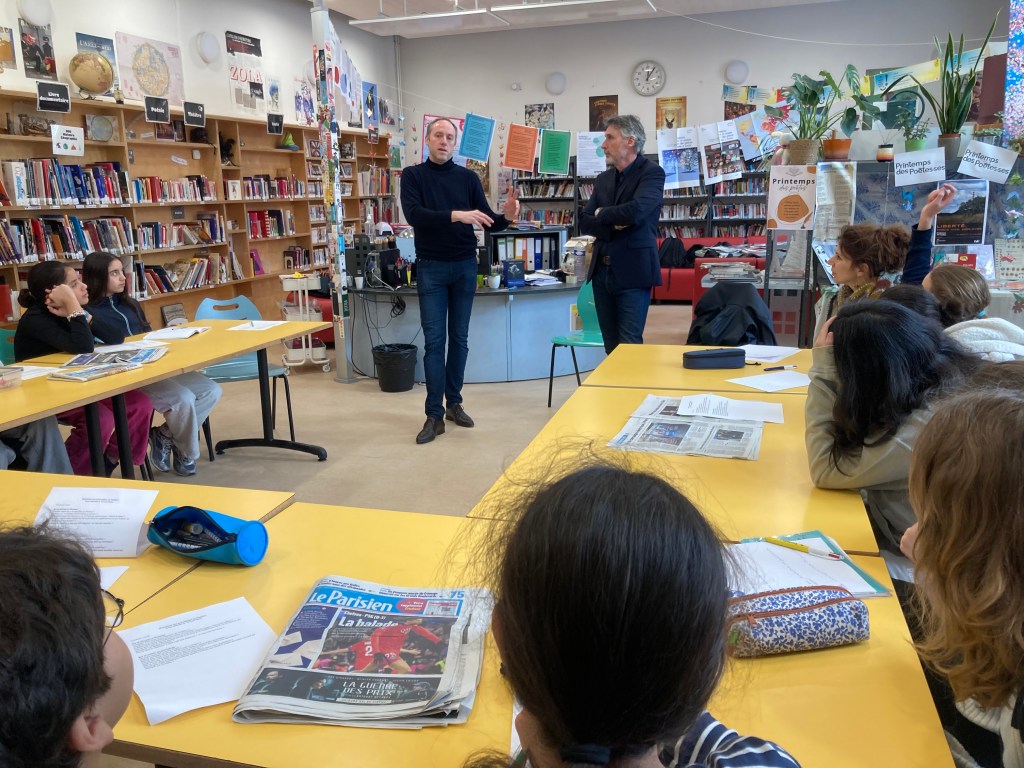 Le vendredi 3 avril, deux journalistes du Parisien sont venus nous rencontrer à l’atelier journal, Erwan Benezet et Vincent Vérier. Ils travaillent au service Économie et sont donc spécialistes des finances publiques et de l’énergie, de la vie des entreprises.