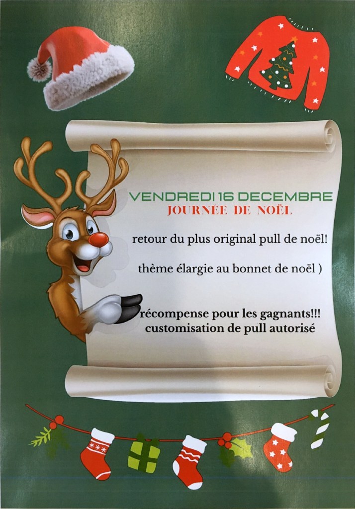 Ce vendredi 16 décembre, le C.V.C (conseil de vie collégienne) organise le concours du pull ou bonnet de Noël le plus moche ou plutôt le « ugly sweater christmas day ». Le but est de venir habillé avec une tenue de Noël (juste pour le haut) la plus moche, la plus originale mais surtout la plus « fun ».