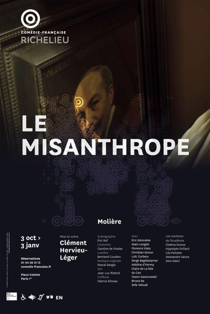 La mise en scène est de Clément Hervieu Léger et ses principaux acteurs sont Loïc Corbery qui joue le rôle d’Alceste, qui est le misanthrope, ainsi qu’Adeline d’Hermy qui joue celui de Célimène, une hypocrite dont Alceste est amoureux. Un misanthrope est une personne peu sociable qui évite les gens.