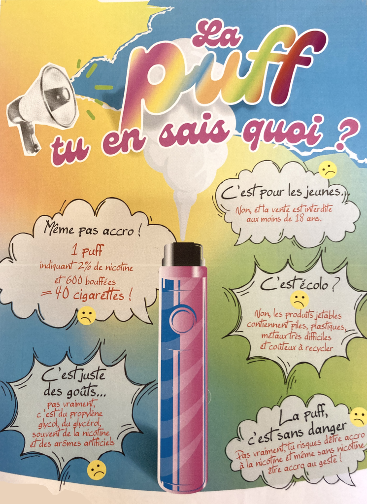 Heureusement, la puff va être interdite en septembre 2024 ! Ouf ! Encore quelques mois à tenir alors ne tombez pas dans le panneau de la puff…