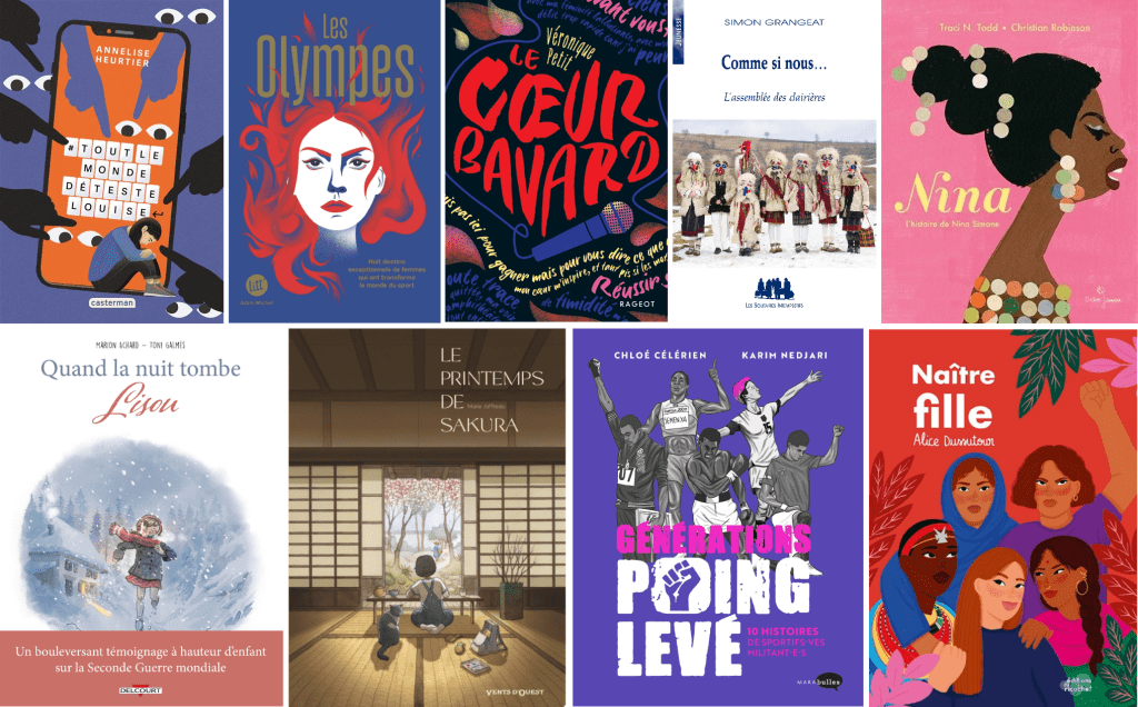 Les livres concernés sont : #ToutlemondedétesteLouise, Les Olympes, Le Cœur bavard, Quand la nuit tombe, Le printemps de Sakura, Génération point levé, Comme si nous, Nina, et Naître fille, soit 9 livres au total de différents genres littéraires : romans, BD, théâtre, documentaire, et albums. Les auteurs de Comme si nous, Simon Grangeat, et de Quand la nuit tombe, Marion Achard, vont peut-être venir se présenter et parler de leur livre et de leur métier d’auteur.ices au collège Jean Moulin en avril et en mai.