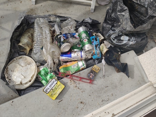 Pendant le trajet jusqu’à l’île aux Moines, nous ramassons une quantité totale de déchets macro-plastiques (visibles à l’œil nu) de 5,1 Kg remplissant 4 sacs de 30 litres. Essentiellement des canettes, des conserves, gobelets en plastiques ou encore gants et emballages.