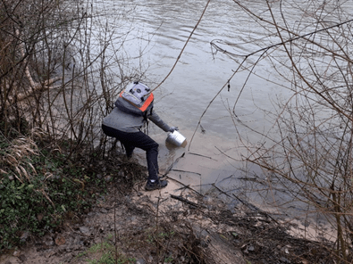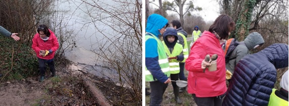 En arrivant sur le lieu, nous avons mesuré 10 m de terrain afin de créer notre site de collecte de micro-plastiques. La Seine étant en crue, ce sont donc nos professeurs accompagnateurs qui ont fait les prélèvements de micro-plastiques dans l’eau avec un pot de confiture. Nous filtrons à la passoire les micro-plastiques en haut de la berge afin de les récupérer.