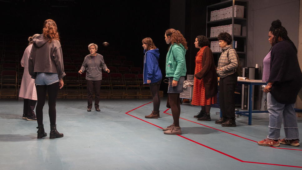 Photo : Véronique Vella, Françoise Gillard, Anna Cervinka, Elise Lhomeau, Elissa Alloula, Séphora Pondi, Lisa Toromanian et Claude Mathieu de la Comédie-Française lors de l’interprétation de la pièce « 7 Minutes » de Stefano Massini et mise en scène par Maëlle Poésie, le 12 septembre 2021 au Théâtre du Vieux-Colombier à Paris.