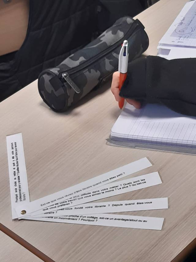 Il nous a expliqué comment sa librairie était organisée. Il travaille avec sa femme. Mais en fonction de la fréquentation, il peut employer jusqu’à deux personnes supplémentaires en CDD (contrat à durée déterminé). C’est le cas par exemple, en période de fête, pour Noël.