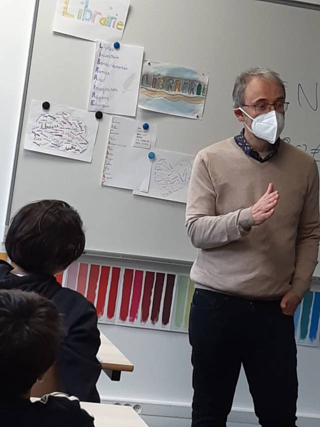 Nous aussi les 5ème A avons la chance de participer au projet « jeune en librairie ». Dans ce cadre Laurent Sachet le libraire de la Chambre verte s’est déplacé jusqu’à notre classe pour nous présenter son métier. Nous avions préparé plein de questions et nous avons pu en une heure seulement en découvrir bien plus sur son métier.