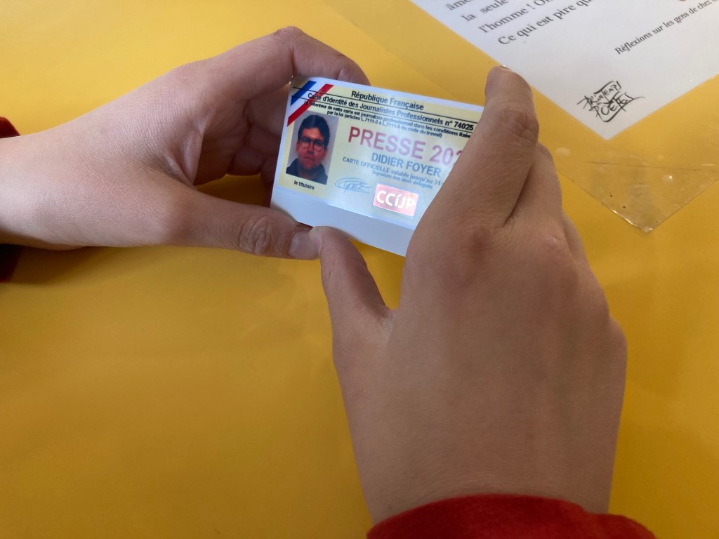 Elle nous a ensuite montré sa carte de presse. C’est ce qui lui attribue son statut de journaliste, et qui lui permet de recevoir des avantages dans notre société. Grâce à celle-ci, nous pouvons payer moins d’impôts, et avoir des réductions pour visiter des sites culturels (musées, expositions…). Cette carte permet aussi d’avoir des « bonus » d’ancienneté, lorsque nous sommes pigistes.