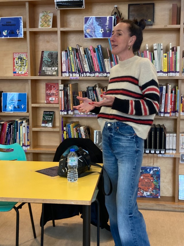 On était curieux de savoir si elle avait rencontré des dangers ou des difficultés dans son métier. Elle nous a dit que, depuis qu’elle était au magazine Arte ce n’était pas du tout dangereux, mais par contre elle nous a dit qu’elle avait été correspondante en Urkraine il y a longtemps et que ce qui était difficile, c’est qu’elle ne parlait pas ukrainien, seulement un peu de russe. Elle trouvait ça très dur de bien faire son métier dans ses conditions !