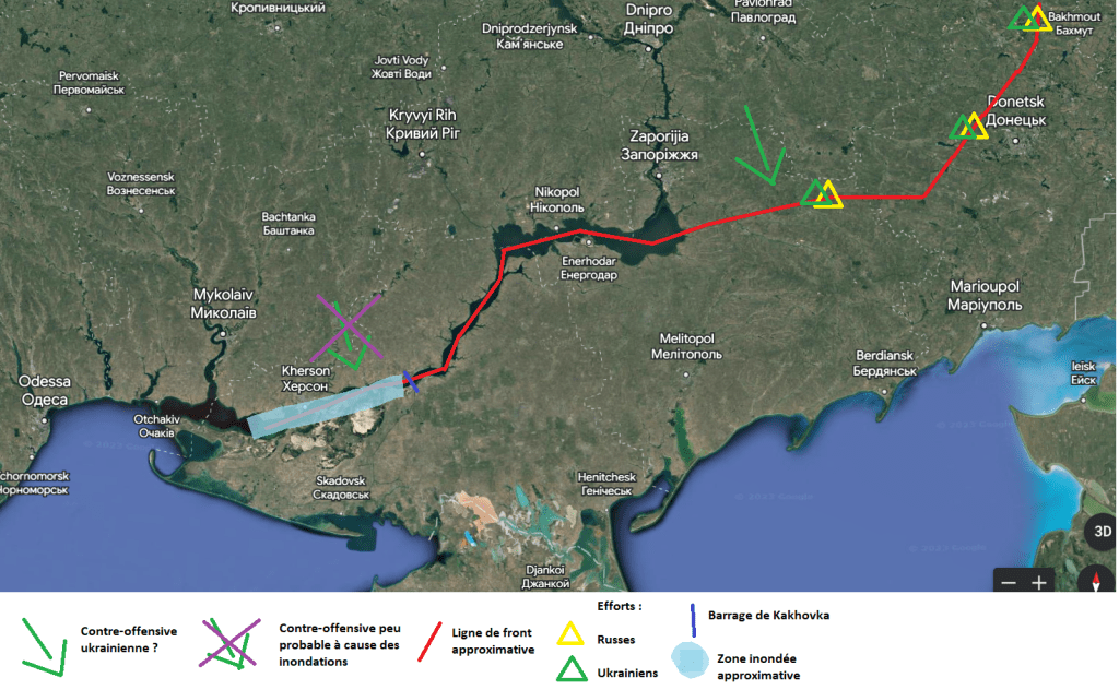 Deux évènements, en Ukraine nous intéresserons aujourd’hui. Dans la nuit du 5 au 6 juin 2023, dans l’oblast (région) de Kherson, on a observé la destruction du barrage de Kakhovka, sur le Dniepr. Les eaux ainsi retenues ont déferlé sur la campagne alentour, provoquant une catastrophe humaine et écologique. Le responsable est inconnu. Dans les jours suivants, on a observé que les Ukrainiens multipliaient les efforts sur certains points du front. Est-ce la « fameuse contre-offensive » tant attendue ? Quelles sont les conséquences de la destruction du barrage pour les plans de Zelensky ?
