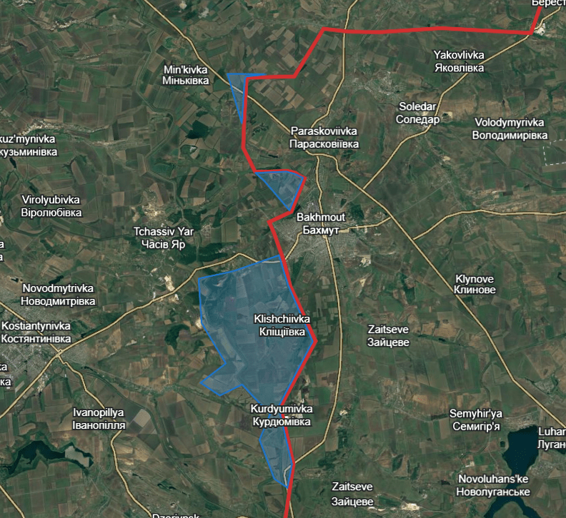 Carte de situation. Au nord-est, on voit Bakhmout, où l’une des plus féroces batailles ukrainiennes a eu lieu. -image Kenzo