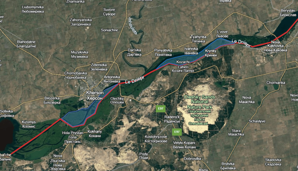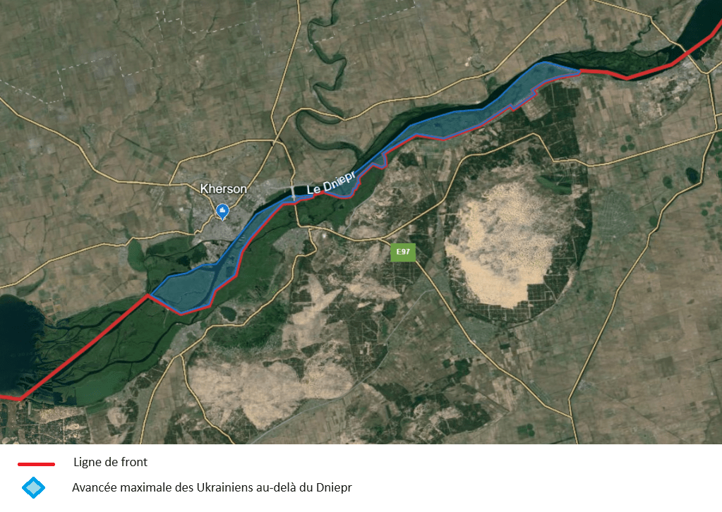 Les têtes de pont plus ou moins tenues par les Ukrainiens au cours de l’automne. Néanmoins, ils rencontrent des difficultés logistiques dues au fait que le seul pont traversant le Dniepr dans la région (visible sur la carte) était endommagé. Le ravitaillement se faisait par bac.