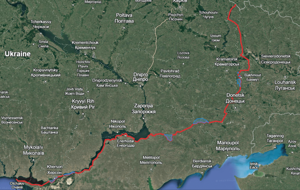 La ligne de front actuelle… En bleu, les avancées ukrainiennes depuis juin. On note notamment des avancées autour de Bakhmout (Est), sur la ligne Zaporijia-Donetsk, ainsi que diverses têtes de pont au delà du Dniepr (Kherson). Image Kenzo
