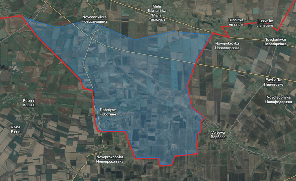 L’avancée, très médiatisée, autour de Robotyne, fin août 2023. Les combats ont été très rudes pour contrôler les deux axes routiers que vous voyez ci dessus. Image Kenzo