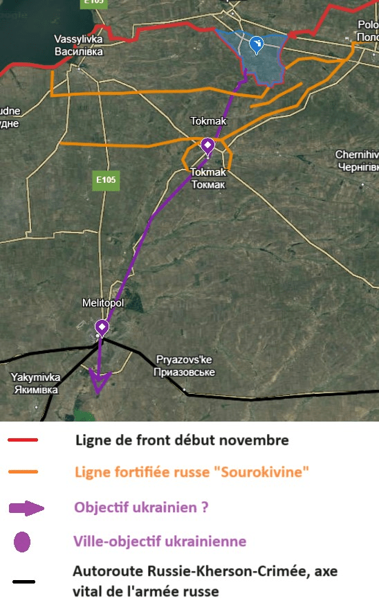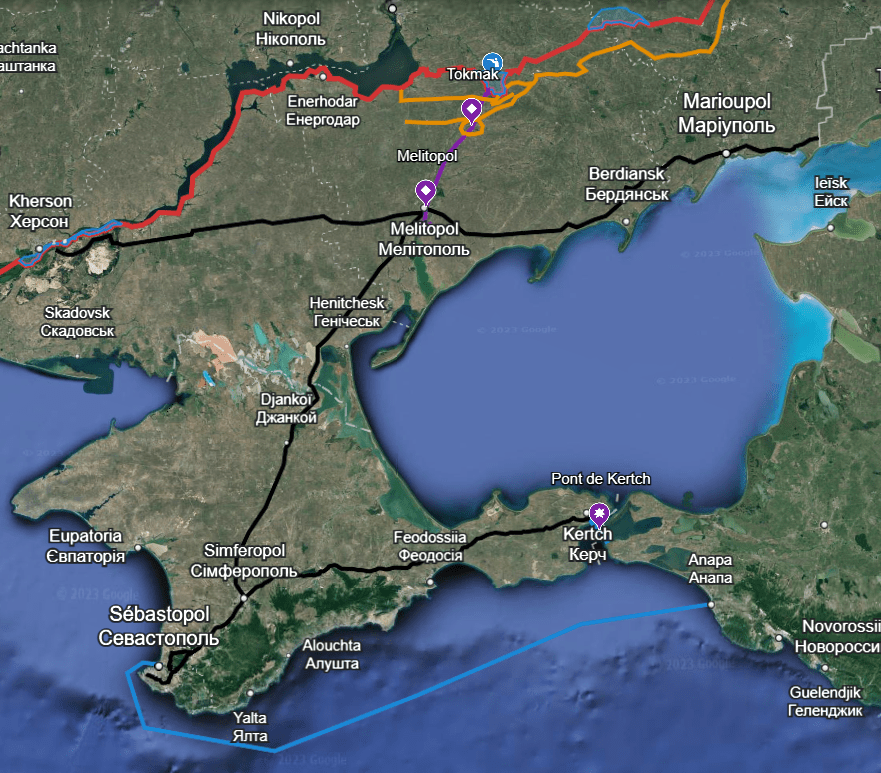 Cela veut dire que si l’autoroute est prise, ou que si elle est à portée de l’artillerie ukrainienne, elle permettrait d’assiéger en quelque sorte les troupes russes qui auraient alors 2 solutions pour survivre et tenir face aux Ukrainiens et se ravitailler : par le pont de Kertch ou pont de Crimée qui relie la Russie à la presqu’île (pont visé continuellement par les drones suicides et missiles ukrainiens, donc pas du tout opérationnel), ou par la mer, avec des navires. Mais les bâtiments russes sont de plus en plus vulnérables aux drones navals ukrainiens, comme on l’a vu cet été, ce serait très difficile de coordonner (surtout dans l’armée russe) les composantes terre et mer, et le port militaire de Sébastopol (Crimée) croule déjà sous le feu ukrainien.