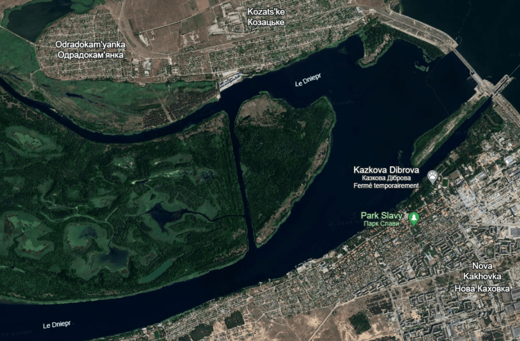 Barrage de Kakhovka sur les eaux du Dniepr. L’aval est vers le bas de l’image. – merci Google Earth ! 😉