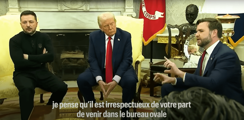 De gauche à droite, V. Zelensky, D. Trump et JD Vance à la Maison blanche / capture d’écran Le Parisienvia Youtube