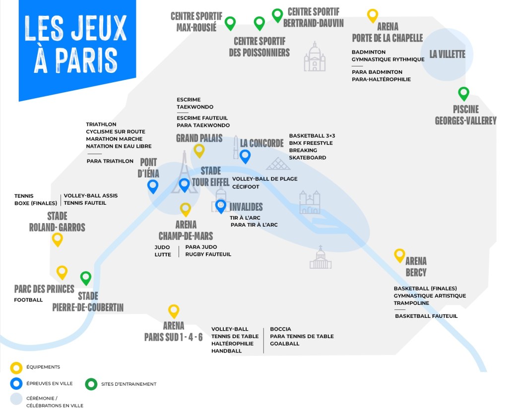 D’autres épreuves se situeront dans des endroits prestigieux de la capitale ou de ses environs (la place de la Concorde pour celles de BMX freestyle, de breaking, de skateboard et de basketball 3×3 et le château de Versailles pour les épreuves d’équitation), ou sur la Seine (nage en eau libre).