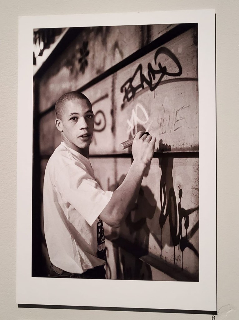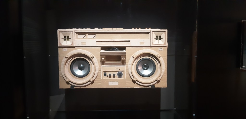 La première partie de l’expo concerne les danseurs qu’on appelle aussi des bboys. On y voit des chaînes avec le logo des crews (groupes de danse), des photos de personnes qui dansent dans la rue et des sculptures en carton comme une de sneakers ou une de boom box. Une œuvre murale représente un train tagué, symbole de la culture du graffiti. Des pochettes de vinyles sont accrochées au mur et on peut écouter des disques de rap sur un lecteur de vinyles (mais il est possible que le son vienne d’enceintes dissimulées). On voit des photos d’artistes dont une photo de Joey Starr adolescent en train de taguer un mur.